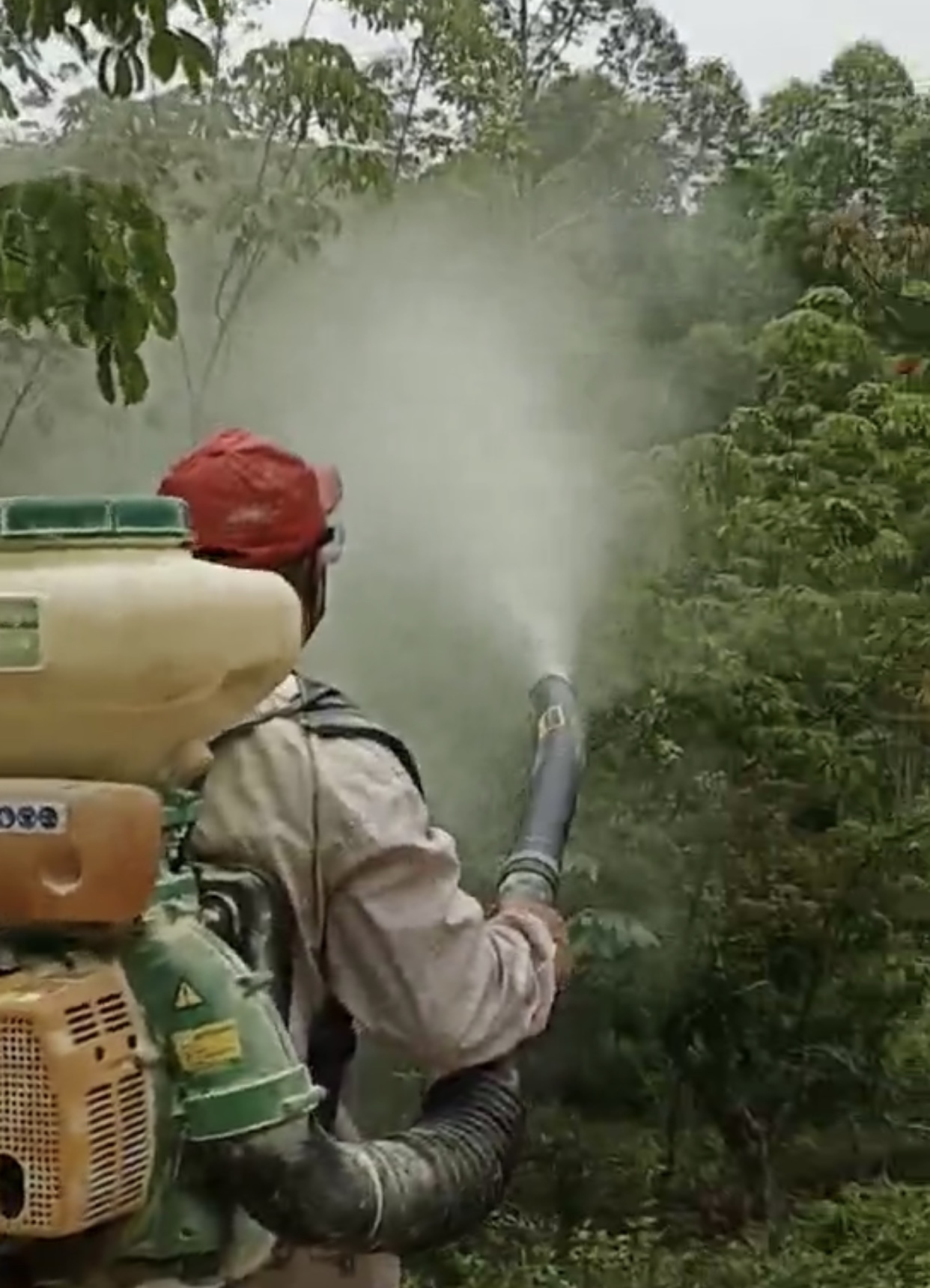 大坪農(nóng)場十分重視橡膠基地“兩病”的防冶工作,把防冶“兩病”工作列入當(dāng)前的重要議事日程。在已深入調(diào)查了解的基礎(chǔ)上,根據(jù)各林段、品系以及蟲害的程度,制定防冶工作方案,有計劃,有步驟地分期實施。階段來,共出動144人次,分成4個小組,全面對橡膠基地進(jìn)行噴藥,技術(shù)人員及時跟進(jìn),組織檢查“回頭看”,盡量把“兩病”造成的損失降到最低限度。